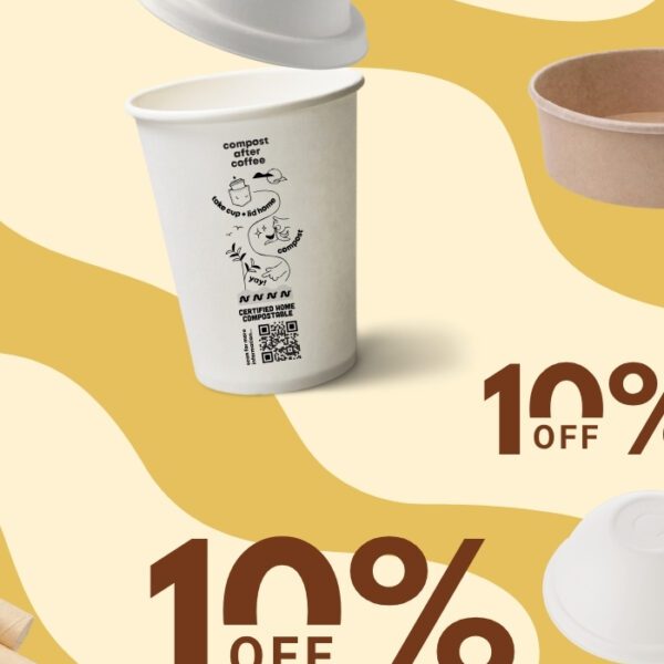 Your next printed cups will be made in Australia, certified home compostable. They are available in single and double wall option, in 6, 8, 12 and 16oz and include our popular Compost After Coffee composting steps. Your lids 80mm or 90mm to fit the cups are also certified home compostable, and will be discounted with any order of your printed cups.Â